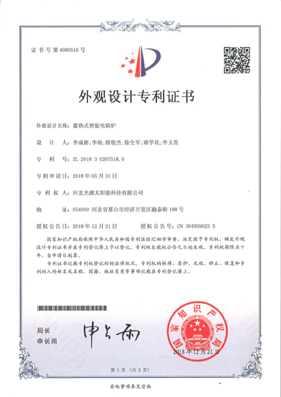 外觀(guān)設(shè)計(jì)專(zhuān)利證書(shū)--蓄熱式智能電鍋爐