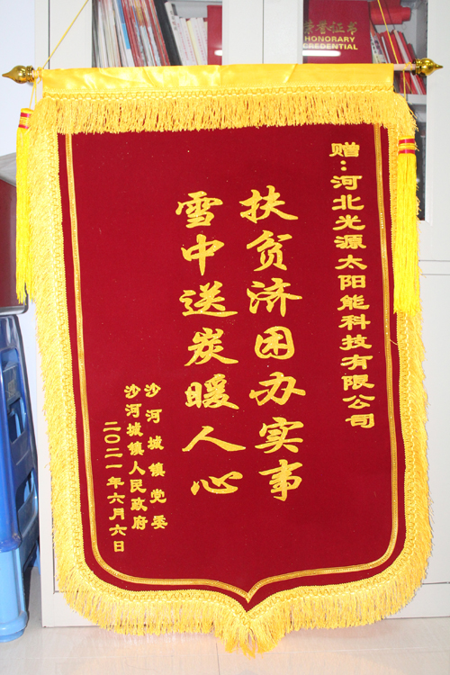 今天光源送給農(nóng)民壁掛爐,鎮(zhèn)黨委政府送來錦旗。錦旗上褒揚(yáng)光源的14個(gè)大字就是余香:“扶貧濟(jì)困辦實(shí)事,雪中送碳暖人心”。這余香是鼓勵(lì)也是激勵(lì),是褒揚(yáng)也有希望。它鼓勵(lì)光源人要多做雪中送碳的人,激勵(lì)光源人多做扶貧濟(jì)困的事兒。光源人不會(huì)辜負(fù)這面錦旗。