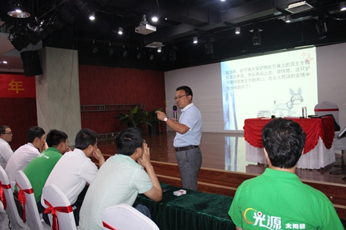 本次培訓(xùn)主要開展了銷售技巧與溝通知識、太陽能技術(shù)知識、生產(chǎn)流程及售后服務(wù)技術(shù)等知識。光源公司領(lǐng)導(dǎo)與學(xué)院進行了深入溝通,了解他們工作中經(jīng)常遇到的困難,對本次培訓(xùn)的內(nèi)容與形式的建議與感受,并用半天時間在生產(chǎn)現(xiàn)場實地講解了,太陽能生產(chǎn)每一道工序的作業(yè)流程和技術(shù)亮點。培訓(xùn)結(jié)束后對各中心經(jīng)理及各地區(qū)業(yè)務(wù)經(jīng)理進行了會議內(nèi)容綜合考試。通過培訓(xùn)讓他們既能增強自身的營銷業(yè)務(wù)知識、太陽能技術(shù)知識、產(chǎn)品知識,又能了解公司的實力和文化。