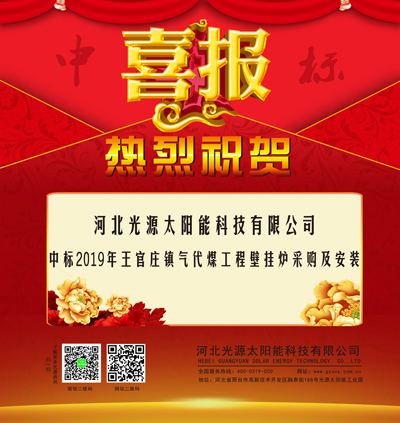 喜報(bào)頻傳,河北光源太陽能科技有限公司,在2019年09月16日,2019年王官莊鎮(zhèn)氣代煤工程壁掛爐采購及安裝項(xiàng)目的競(jìng)標(biāo)中,憑借過硬的產(chǎn)品質(zhì)量,扎實(shí)高效的工作作風(fēng),卓越的運(yùn)作團(tuán)隊(duì)和良好的企業(yè)信譽(yù),以絕對(duì)的優(yōu)勢(shì)順利中標(biāo)。