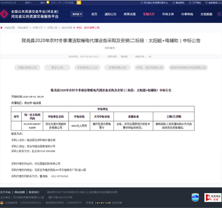 河北光源太陽能科技有限公司憑借完善細致的服務(wù)成功中標隆堯縣2020年農(nóng)村冬季清潔取暖電代煤設(shè)備采購及安裝(二標段:太陽能+電輔助)。中標喜訊紛至沓來,彰顯了本公司專業(yè)的施工實力與良好的市場口碑。