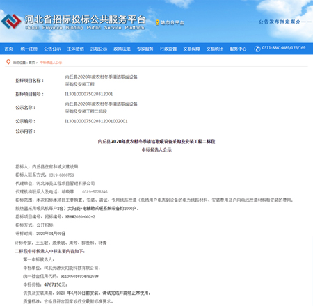 在抗疫的關(guān)鍵時(shí)期,復(fù)工復(fù)產(chǎn)正在如火如荼的進(jìn)行,沒有什么能比一份中標(biāo)通知書更能振奮人心了。在營銷工作舉步艱難的特殊時(shí)期,河北光源太陽能科技有限公司,中標(biāo)內(nèi)丘縣2020年度農(nóng)村冬季清潔取暖設(shè)備采購及安裝工程,為我公司2020年度輝煌的經(jīng)營業(yè)績再添濃墨重彩的一筆。
