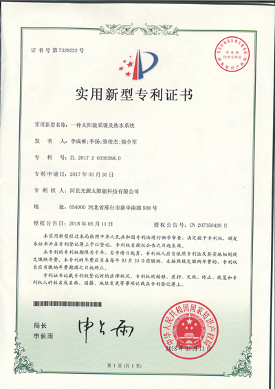實(shí)用新型專利證書--一種太陽(yáng)能采暖及熱水系統(tǒng)(2)